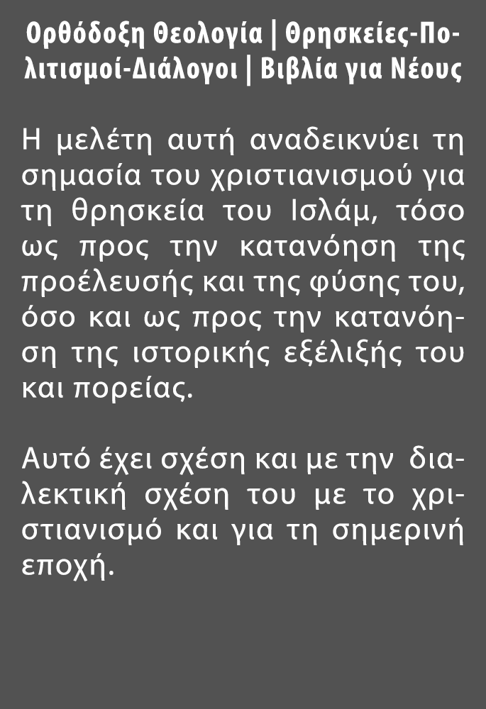 Στο βιβλίο αυτό αναδεικνύεται η σημασία του χριστιανισμού για την κατανόηση της προέλευσης και της φύσης του Ισλάμ, αλλά και για την ιστορική εξέλιξή του και την πορεία του και περαιτέρω για την διαλεκτική σχέση του με τον χριστιανισμό και για τη σημερινή εποχή.