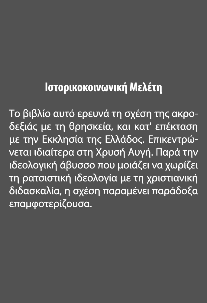 Το βιβλίο αυτό ερευνά τη σχέση της ακροδεξιάς με τη θρησκεία, και κατ’ επέκταση με την Εκκλησία της Ελλάδος. Επικεντρώνεται ιδιαίτερα στη Χρυσή Αυγή. Παρά την ιδεολογική άβυσσο που μοιάζει να χωρίζει τη ρατσιστική ιδεολογία με τη χριστιανική διδασκαλία, η σχέση παραμένει παράδοξα επαμφοτερίζουσα. Ποιο είναι το υπόβαθρο και η προφάνεια αυτής της σχέσης;